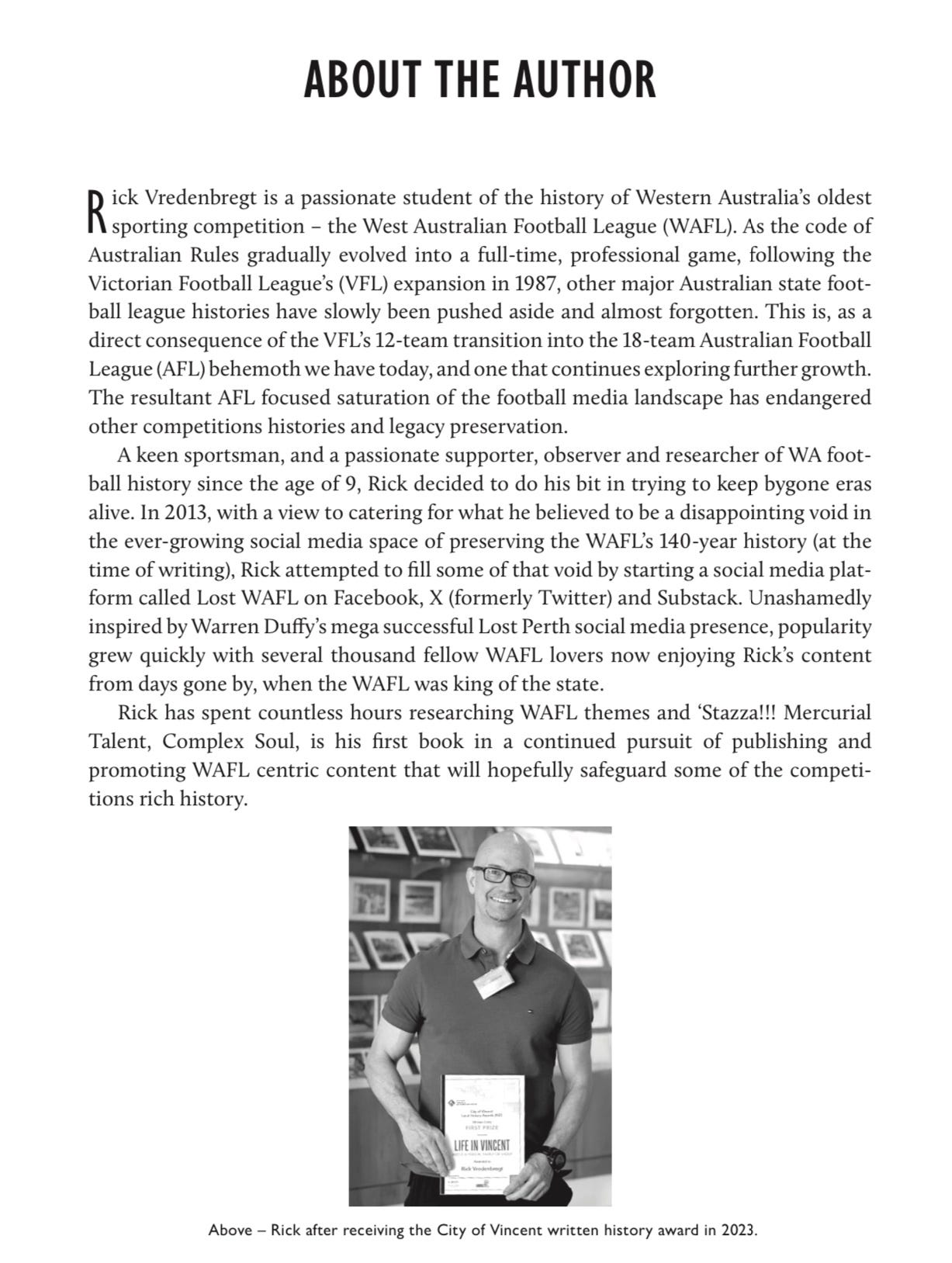 ‘Stazza, The Football Career of Chris Stasinowsky; Mercurial Talent, Complex Soul’, is an in-depth analysis of an Australian rules football career that included time in Western Australia and South Australia at the peak of top-level competition Australia wide pre-VFL/AFL national league expansion.