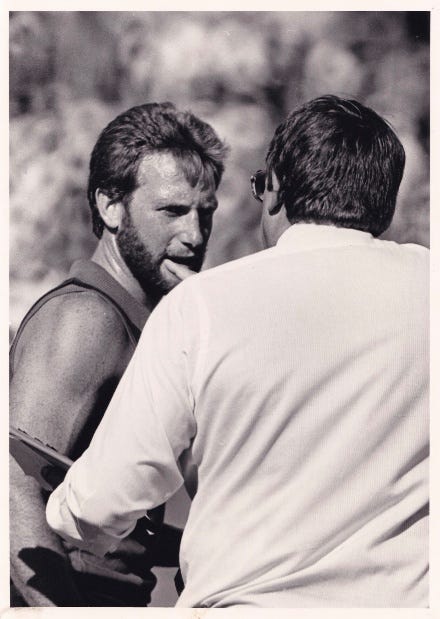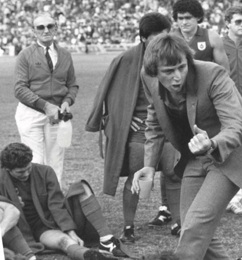 Above: Dennis Cometti urging on his Falcons charges in 1982. Source: Sean Cowan.